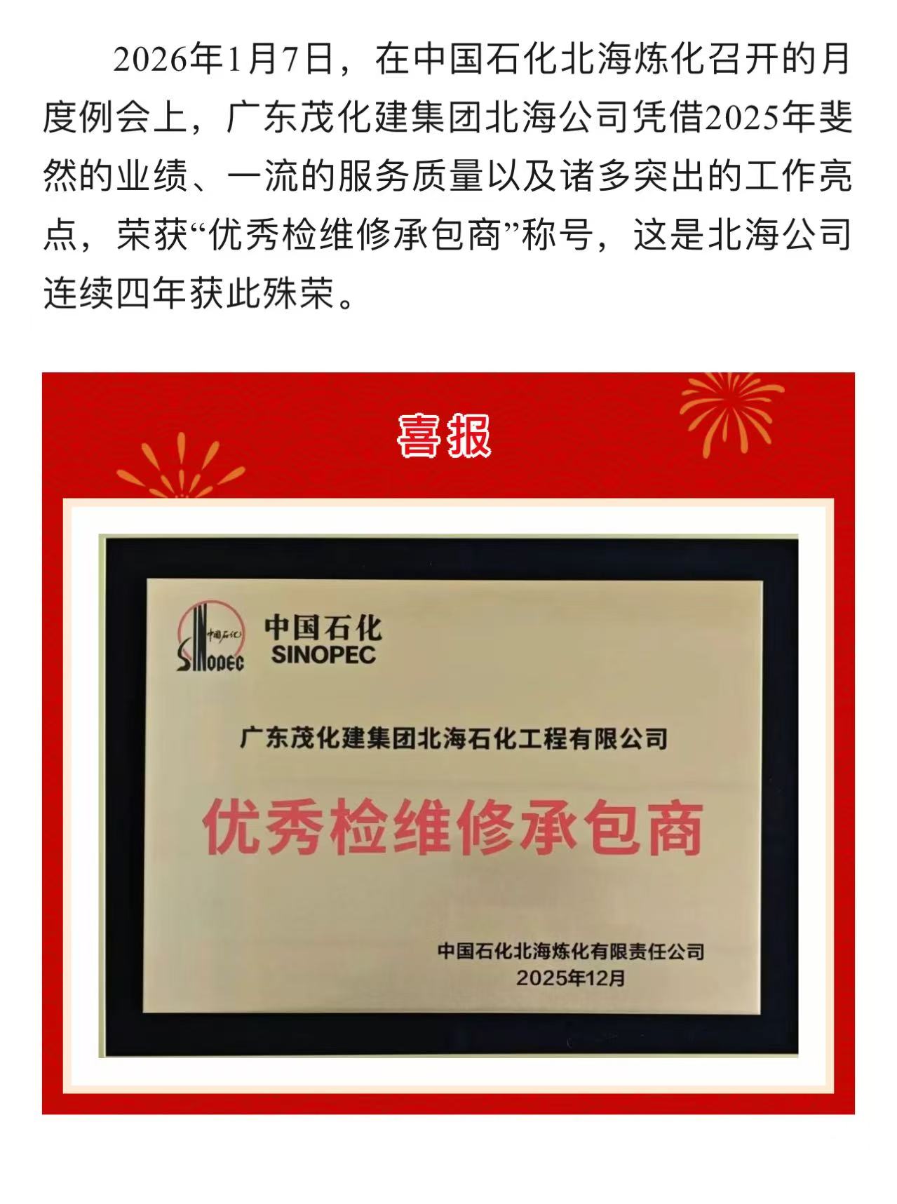 喜報(bào) | 廣東茂化建集團(tuán)北海公司榮獲2025年度“優(yōu)秀檢維修承包商”稱(chēng)號(hào)